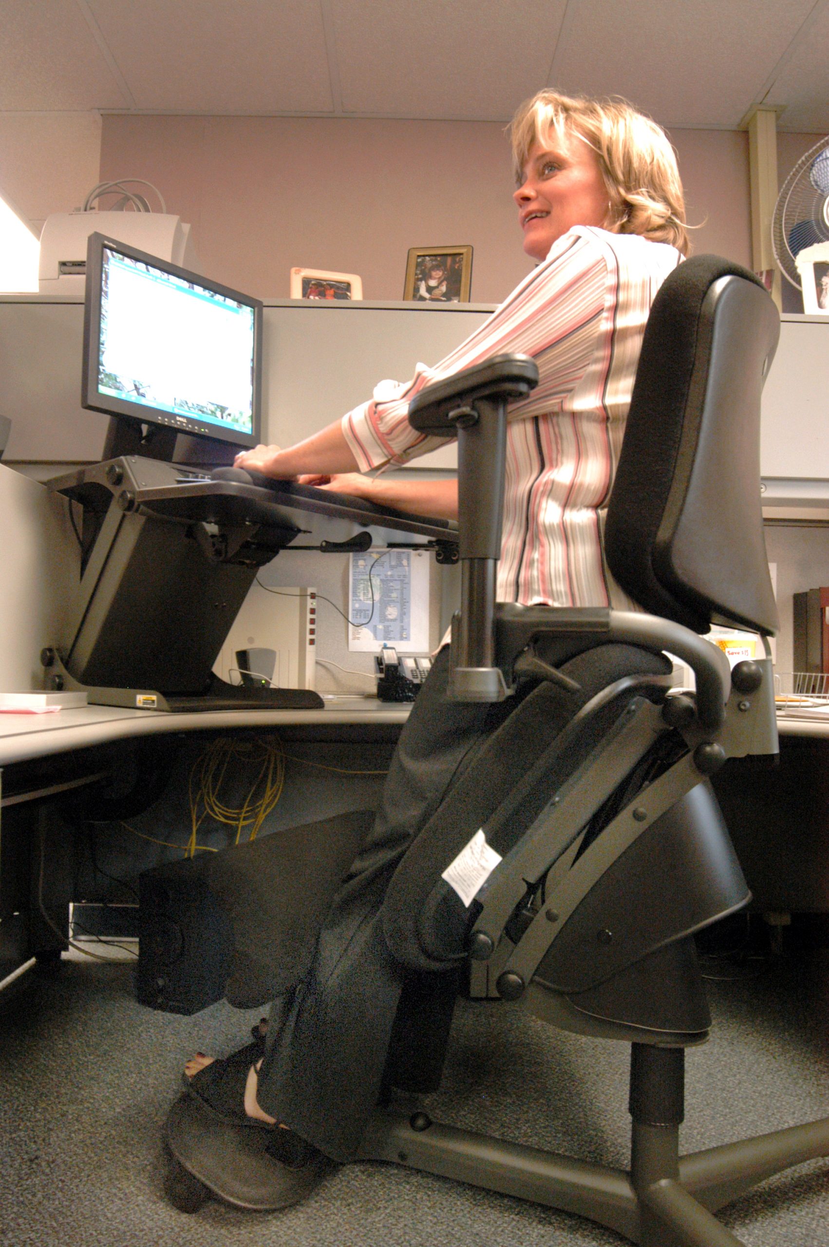 The LeanRite™ Elite, ergonomic office chair, for height adjustable desks offers a therapeutic standing platform with a built-in anti-fatigue mat. In a seated position, the soft padded seat tilts forward to encourage a neutral seated posture which helps strengthen core muscles. When leaning against the LeanRite’s padded edge in a standing position, the lower back can be massaged and stretched throughout the day and relieve typical back pain associated with tight muscles or sciatica. The LeanRite allows users to sit at a chair-seated height, raise partially to allow perching or extend fully to allow for a lean.
