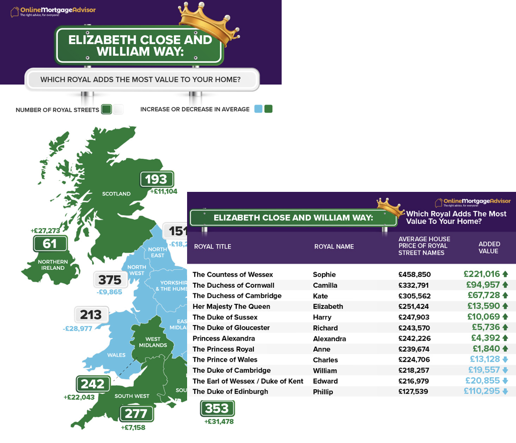 With almost 3,000 royal-related street names across the UK, OnlineMortgageAdvisor.co.uk were keen to discover whether having a royal included in your road name can affect the price of your home. Using Zoopla and Streetlist, they scanned through each road in the UK and its average house price to uncover which royals can help you increase your home’s value.