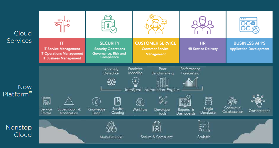 ServiceNow can be divided into three faces – The Nonstop cloud, the new platform, and various cloud services. The nonstop cloud is always active for its users and customers. It allows users to store and organize the data without ever taking it offline. It uses a multi-instance model, which helps the users to customize the services which would be according to their requirements. While providing these services to ServiceNow makes sure that the data stored is highly secured and safe.